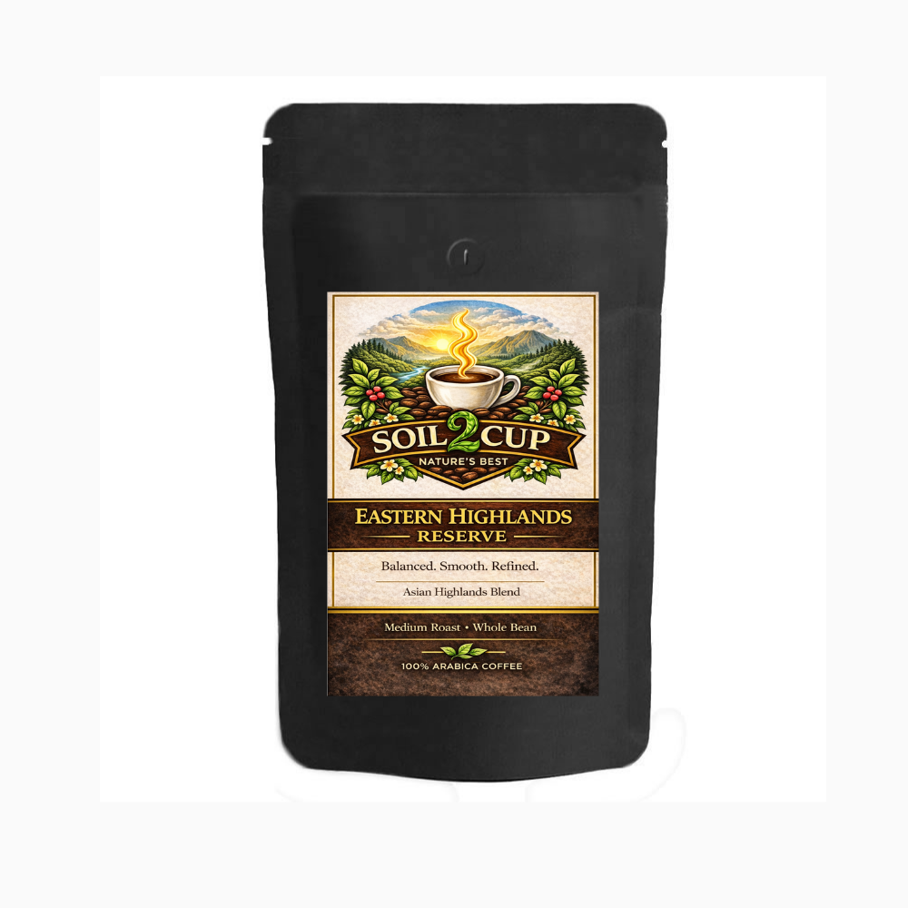 Eastern Highlands Reserve is a carefully crafted medium roast blend sourced from select coffee-growing regions across Asia, including Laos, Timor, India, Papua New Guinea, Sulawesi, and Sumatra. Grown in high-altitude environments, these beans develop a smooth, well-balanced profile with subtle sweetness and gentle complexity.